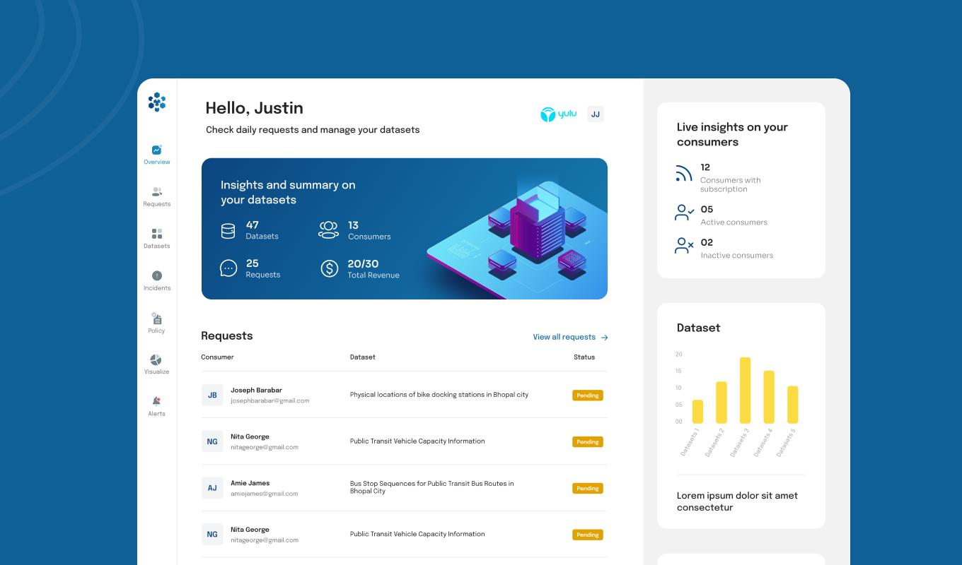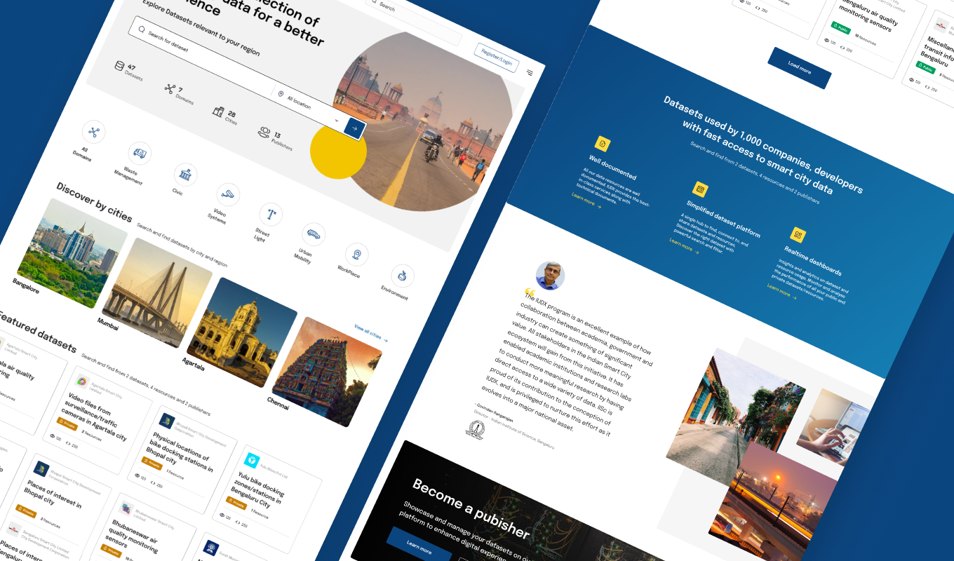 For the website, we designed the main home page with clear categorization of dataset domains and cities. For each city, we created a city home page with relevant datasets and simplified the navigation between pages. For the portal, we implemented a dashboard design with graphical representation, making it easy to identify different KPIs. Moreover, we optimized the various listing views and simplified the user flows.